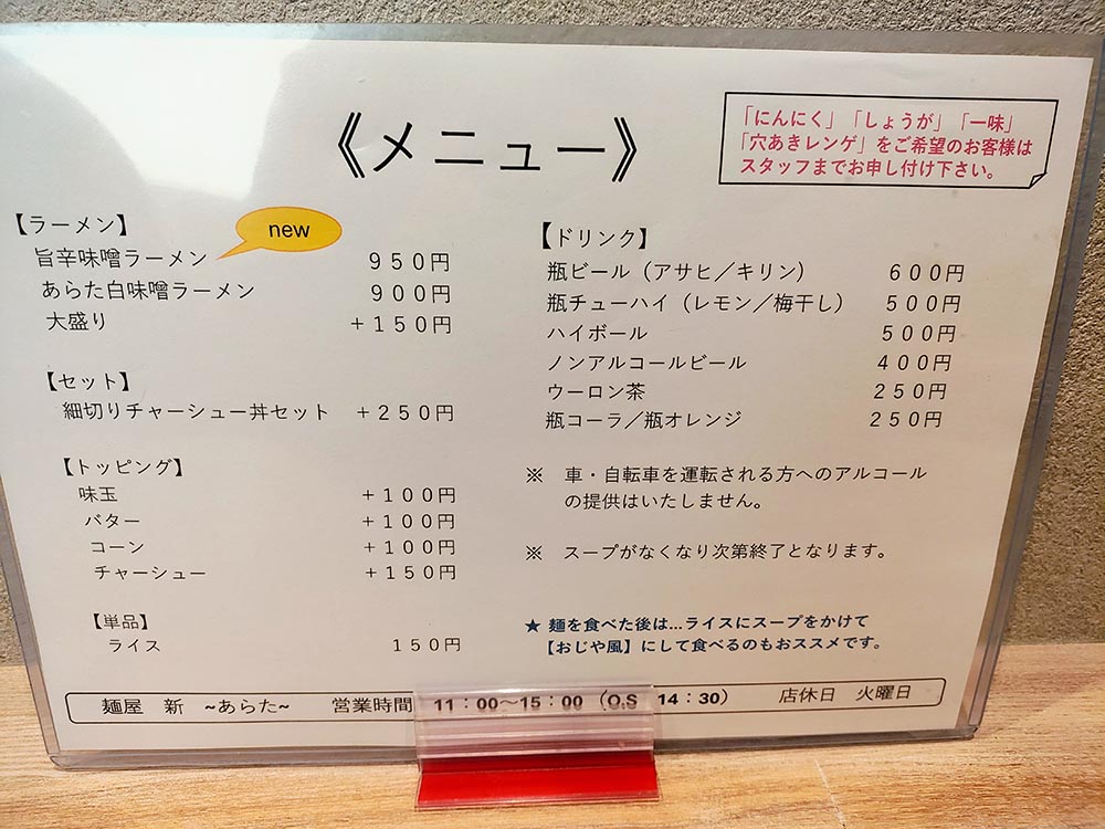 旨辛味噌ラーメンとあらた白味噌ラーメンの2種類です。旨辛味噌にはNEWのマークがついているので最近できたメニューだと思います。今回私はあらた白味噌ラーメンの大盛を注文しました。